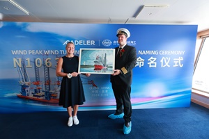 Cadeler has received its first P-class jack-up installation vessel, Wind Peak, from the Cosco Shipping Heavy Industry (Cosco) shipyard in Qidong, China. The vessel was officially named during a celebratory ceremony at the shipyard and is now ready to begin commercial operations.