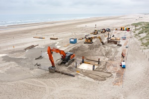 Excavation work started on Velsen beach, The Netherlands, to remove seven 'obstacles' from the sand at a depth of several metres. Those 'targets' were located during the earlier investigation for unexploded explosives from World War II.The objects will be removed for the construction of the sea cables, which TenneT will use to bring the energy of the offshore wind farm Hollandse Kust (west Beta) ashore from 2026. Using technology attached to a drone, Tennet looked down into the soil to a depth of about ten metres. This is how they found 13 'suspect locations' in the beach. After test drilling, seven targets remained, which they will now excavate. Next autumn, south of Wijk aan Zee on the Velsen beach (near De HangOut), work will start on the connection of the Hollandse Kust (west Beta) wind farm.